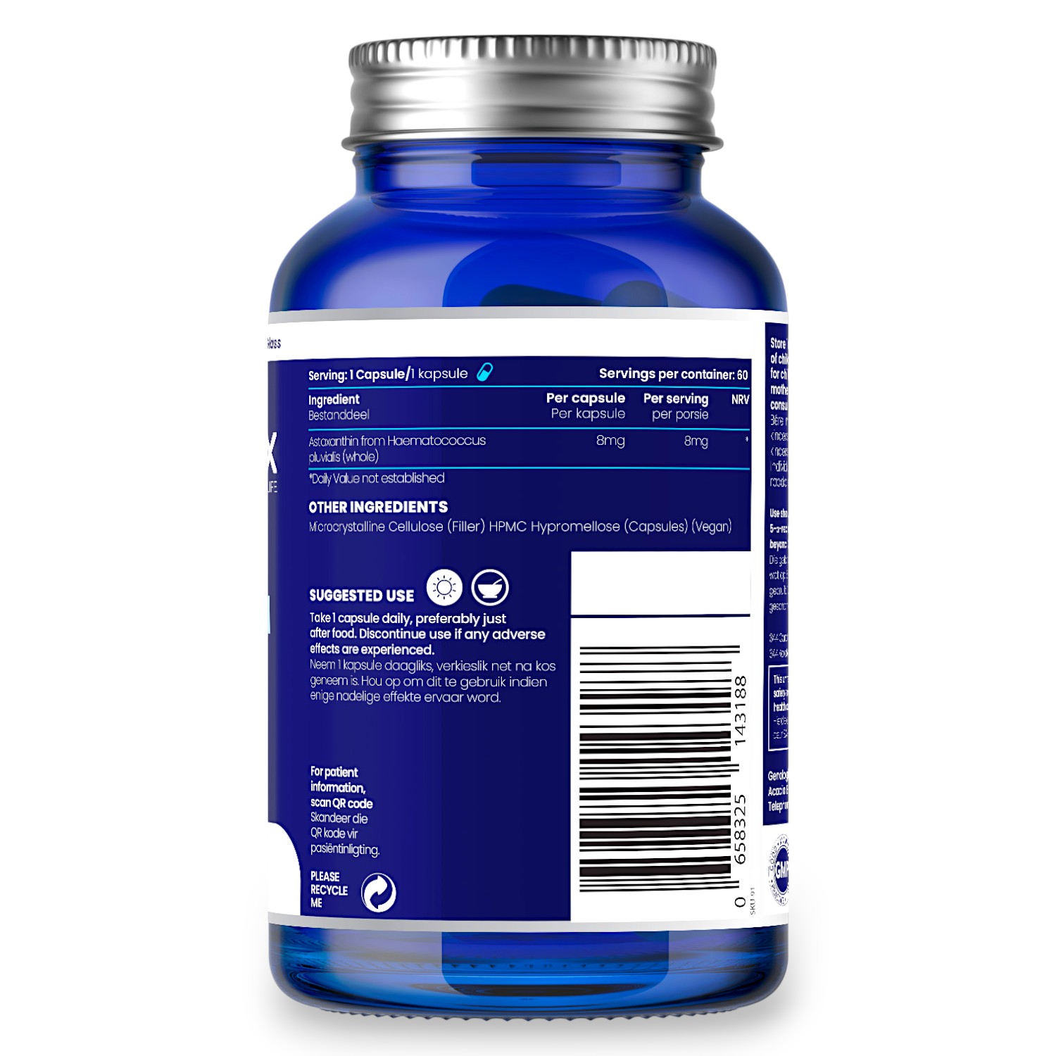 - 60 vegan capsules (Halal & Kosher) each containing 10mg of Astaxanthin = 60 servings of 8mg Astaxanthin.