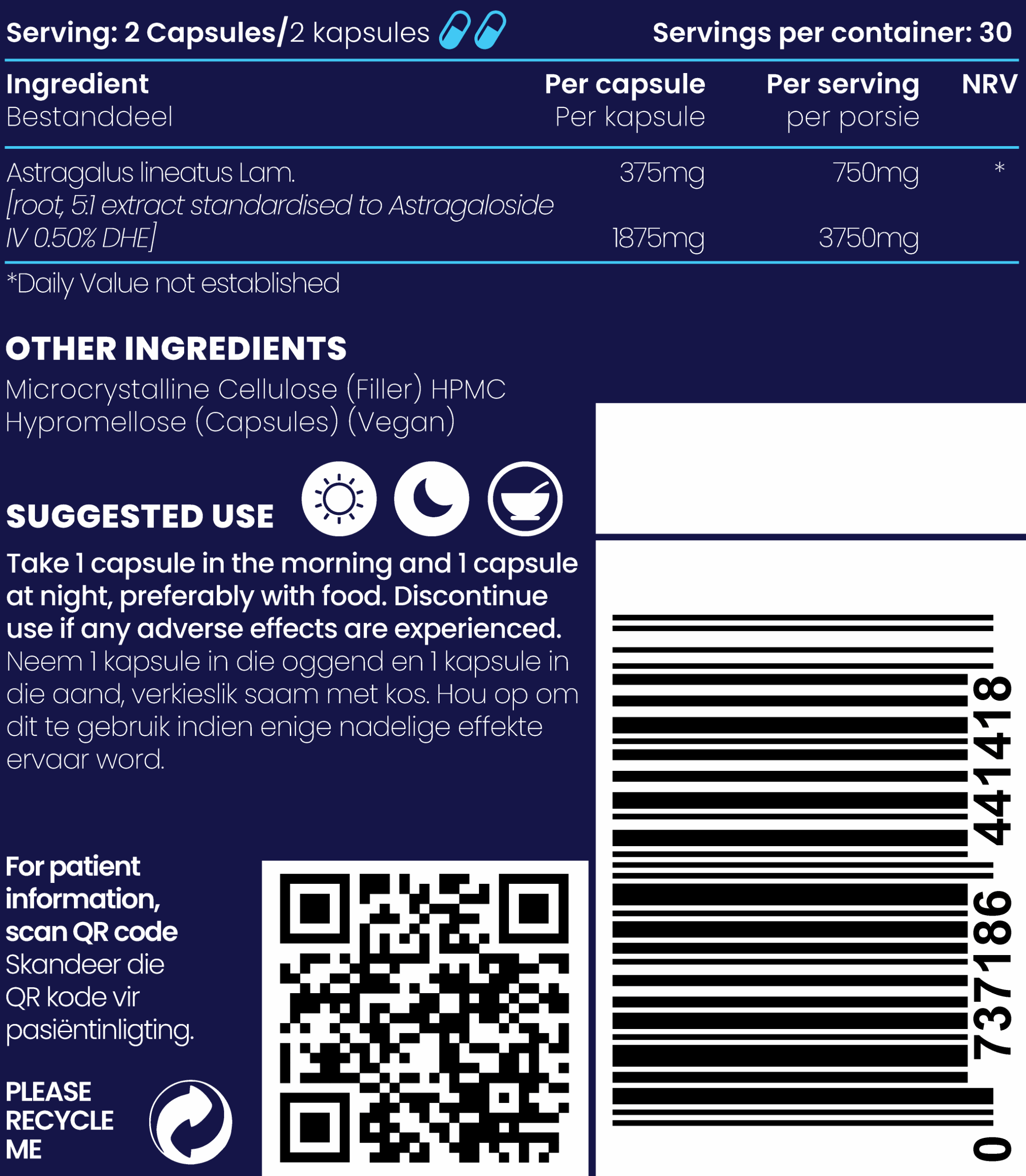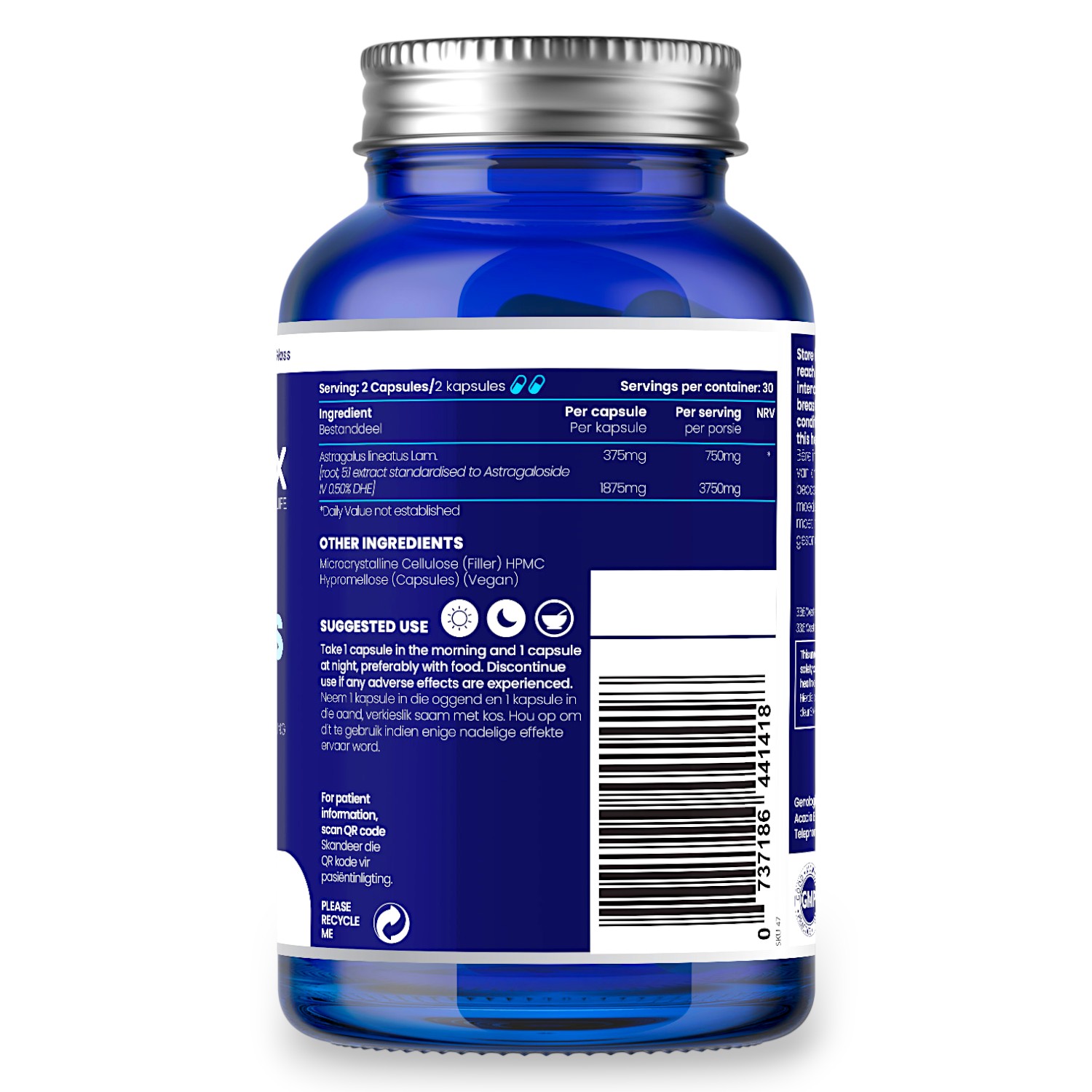 - 60 vegan hard capsules (Halal & Kosher) each containing 375mg of Astragalus (Astragaloside IV 0.5%) = 30 servings of 750mg Astragalus (Astragaloside IV 0.5%)