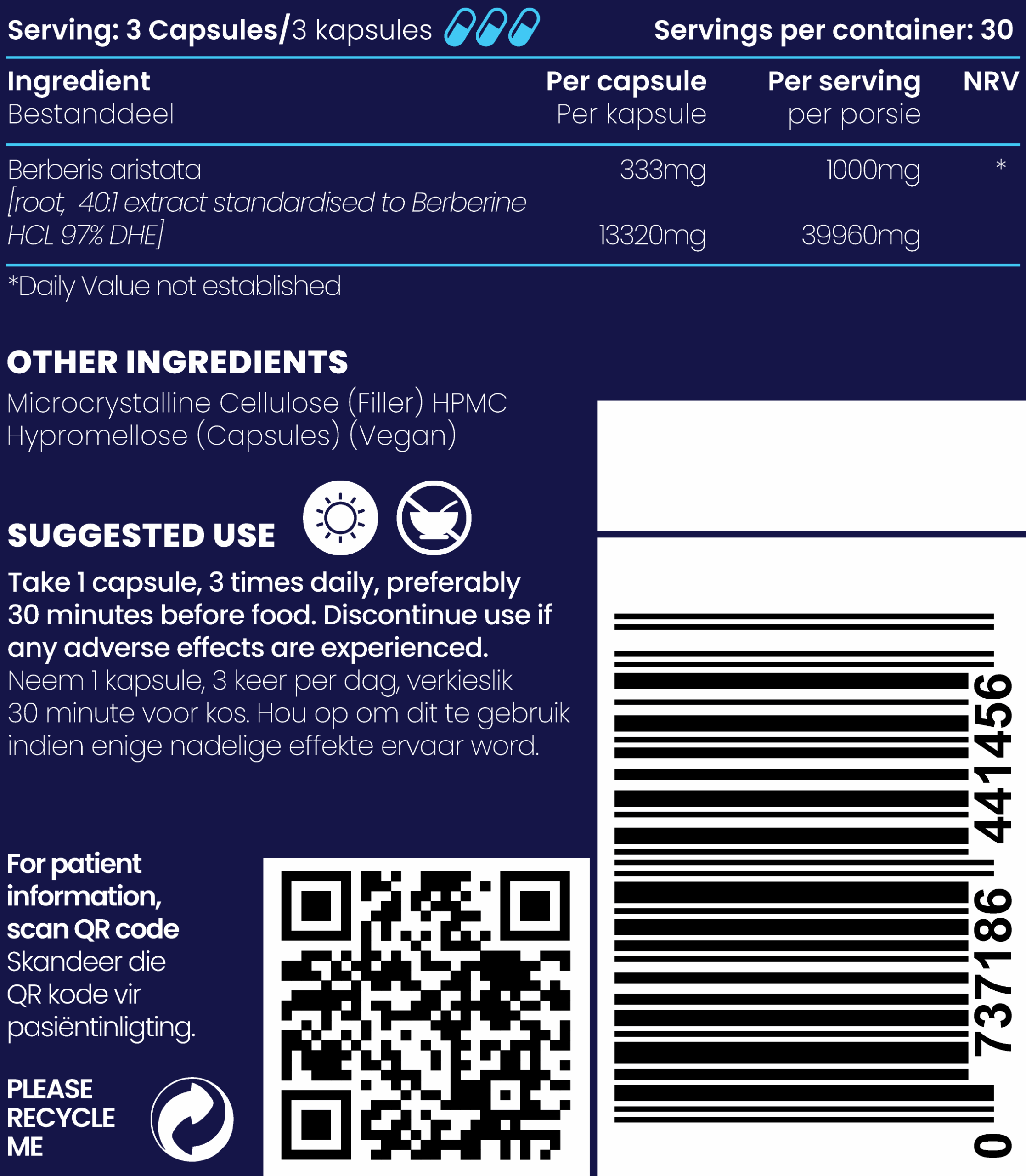 - 90 vegan hard capsules (Halal & Kosher) each containing 333mg of Berberine HCL (Berberis Wilsoniae Hemsl. Extract) = 30 servings of 1000mg Berberine HCL (Berberis Wilsoniae Hemsl. Extract)