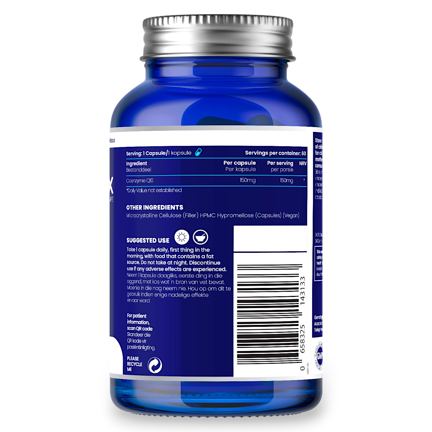- 60 vegan hard capsules (Halal & Kosher) each containing 150 mg Co-enzyme Q10 = 60 servings of 150 mg Co-enzyme Q10