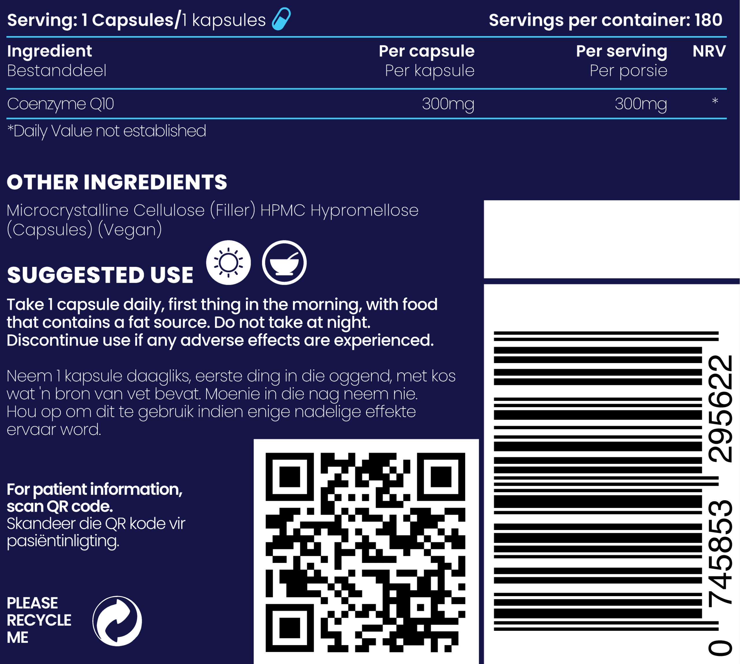 - 180 vegan hard capsules (Halal & Kosher) each containing 300 mg Co-enzyme Q10 = 180 servings of 300 mg Co-enzyme Q10