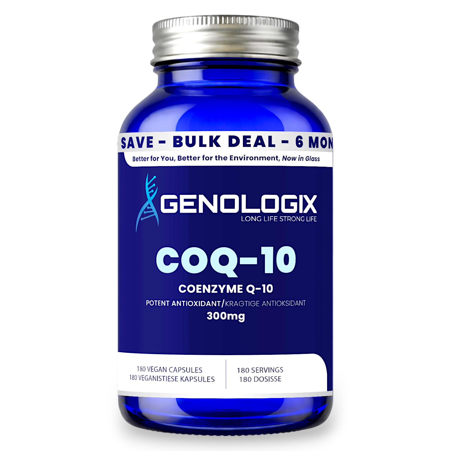 This is a 6 month BULK version of our 300mg CoQ-10. Genologix CoQ-10 (Coenzyme Q-10 or Ubiquinone) is an extremely powerful anti-oxidant that is found in every living creature on earth. It’s also essential for maintaining optimal energy production in our cells. Most people don’t get enough CoQ-10, owing to poor diet.