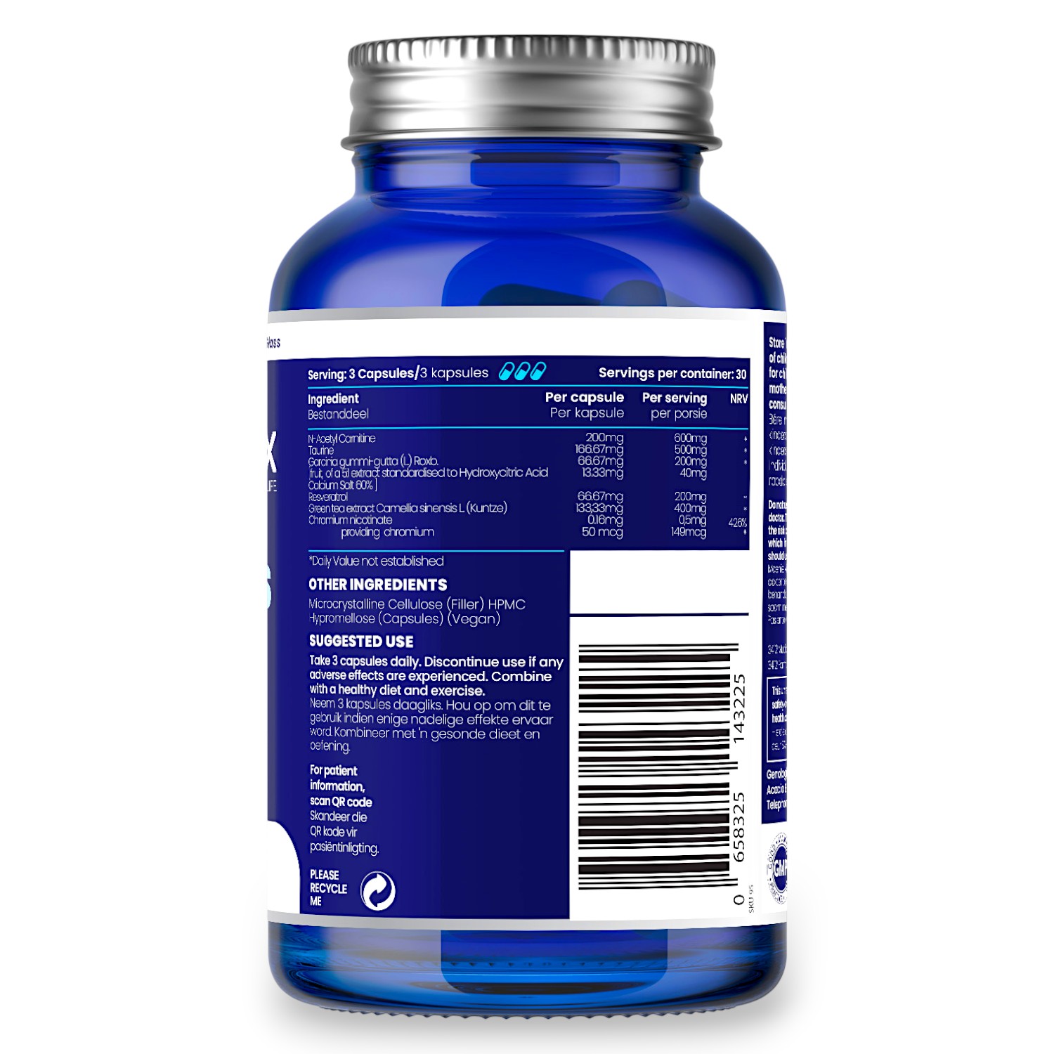 - 90 vegan hard capsules (Halal & Kosher) each containing 166mg Taurine + 200mg N-Acetyl Carnitine + 66mg Garcinia Cambogia + 66mg Resveratrol 133mg Epicatechin (Green Tea Extract) + 166mcg Chromium Nicotinate (50mcg Chromium) = 30 Servings of 500mg Taurine + 600mg N-Acetyl Carnitine + 200mg Garcinia Cambogia + 200mg Resveratrol 400mg Epicatechin (Green Tea Extract) + 500mcg Chromium Nicotinate (149mcg Chromium)