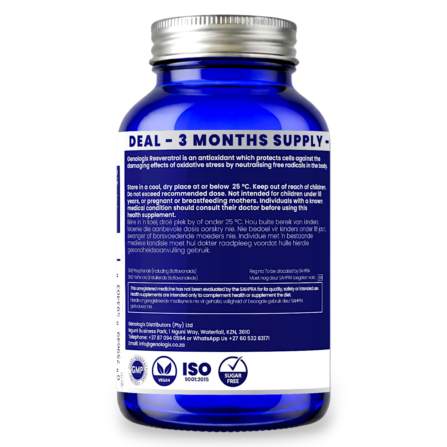When you’re purchasing a Genologix product, you’re receiving only the absolutely purest Resveratrol. Our Resveratrol is proudly produced under the guidance of our registered manufacturing pharmacist, in an ISO9001, ISO22000, GMP-compliant facility in KwaZulu-Natal. When you purchase a Genologix product you can be sure that you are receiving a high purity, effective dosage supplement.