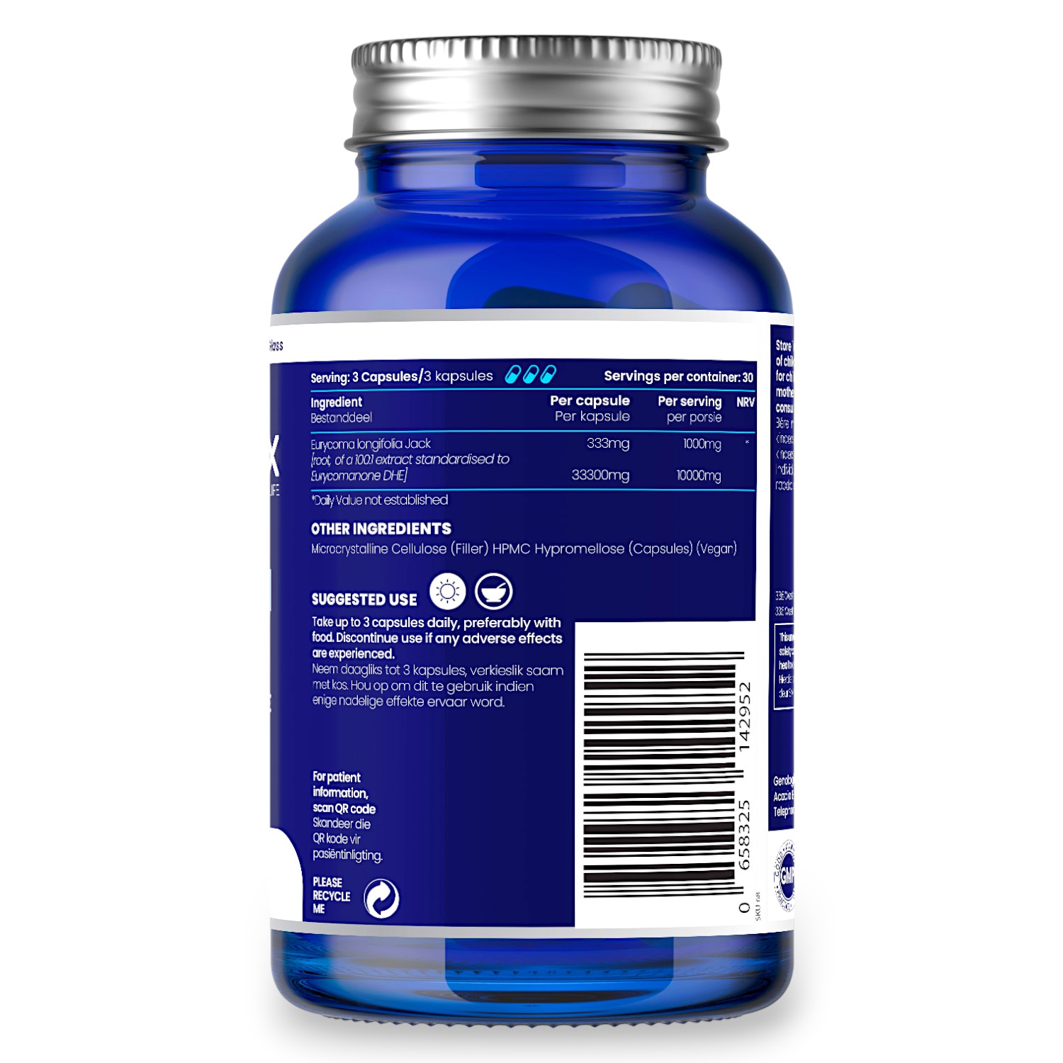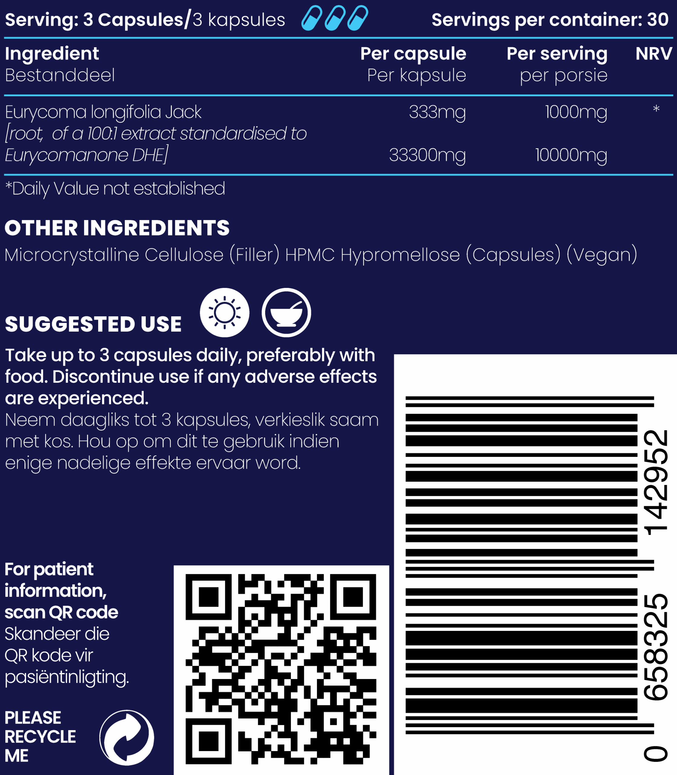- 90 vegan hard capsules (Halal & Kosher) each containing 333mg of Tongkat Ali Extract = 30 servings of 1000mg Tongkat Ali Extract.