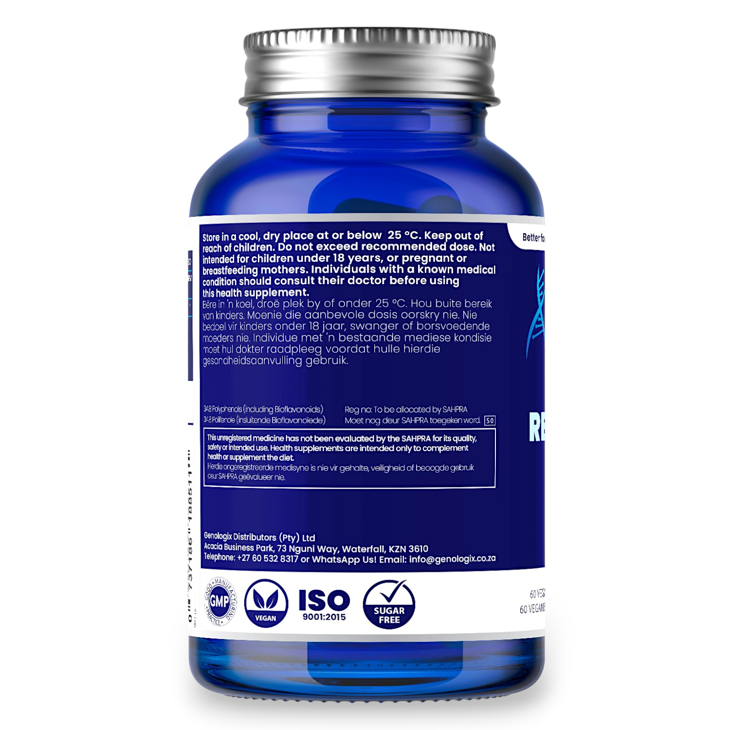 When you’re purchasing a Genologix product, you’re receiving only the absolutely purest Resveratrol. Our Resveratrol is proudly produced under the guidance of our registered manufacturing pharmacist, in an ISO9001, ISO22000, GMP-compliant facility in KwaZulu-Natal. When you purchase a Genologix product you can be sure that you are receiving a high purity, effective dosage supplement.